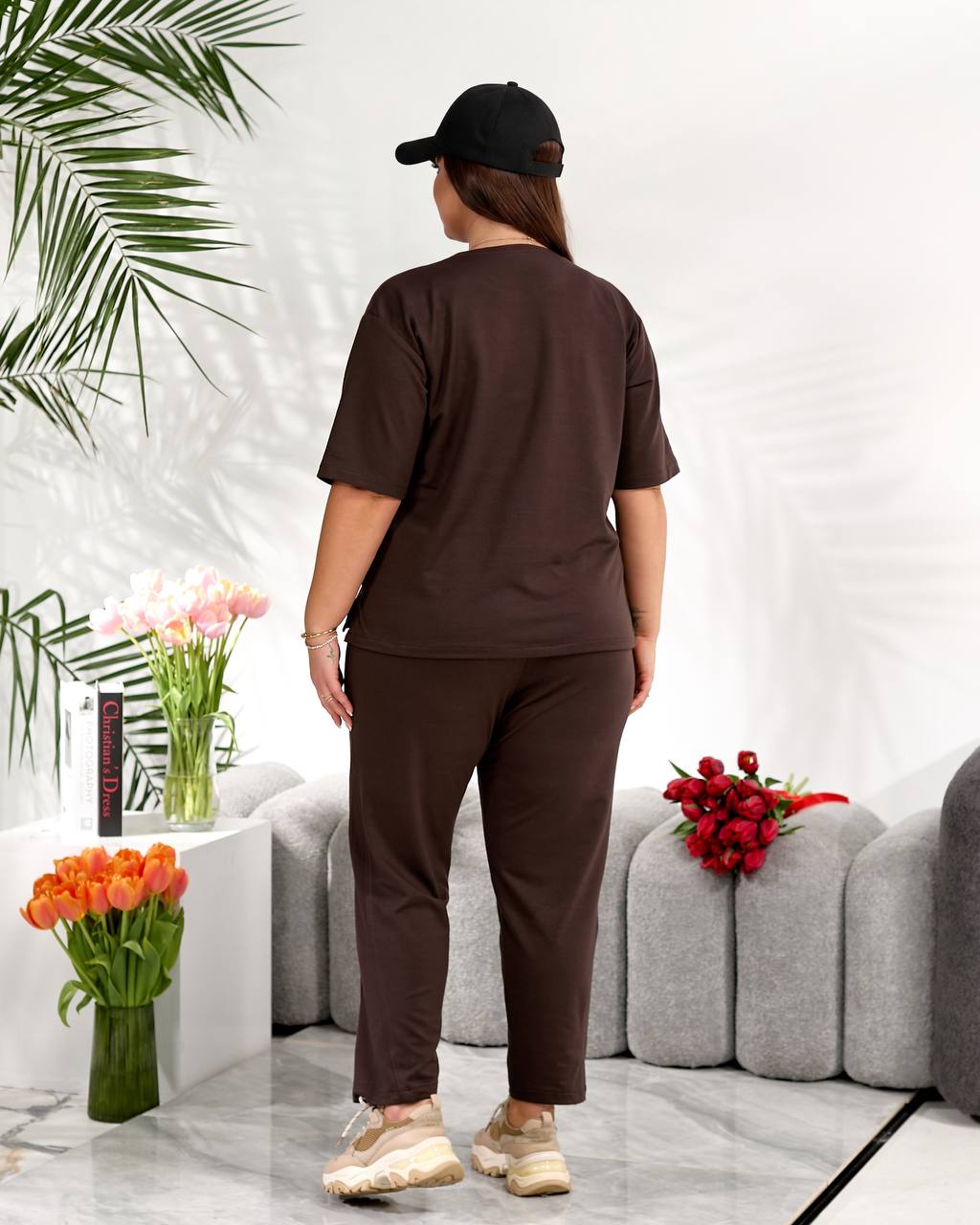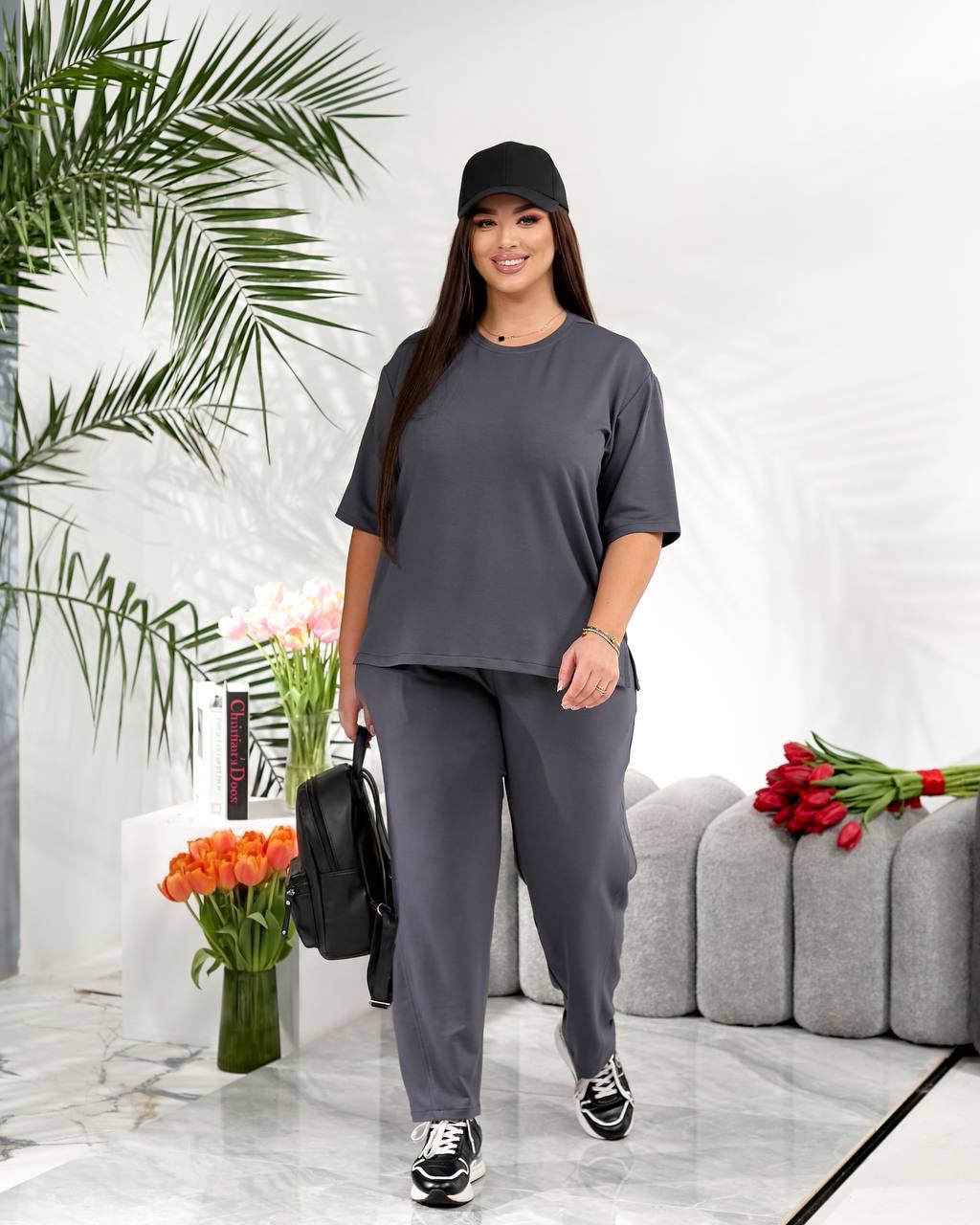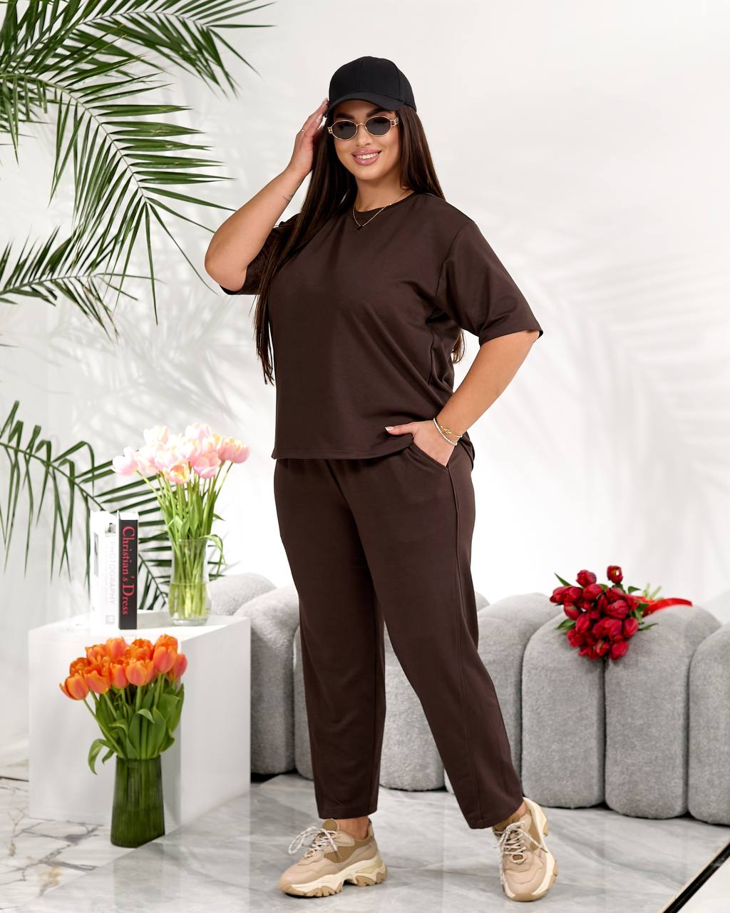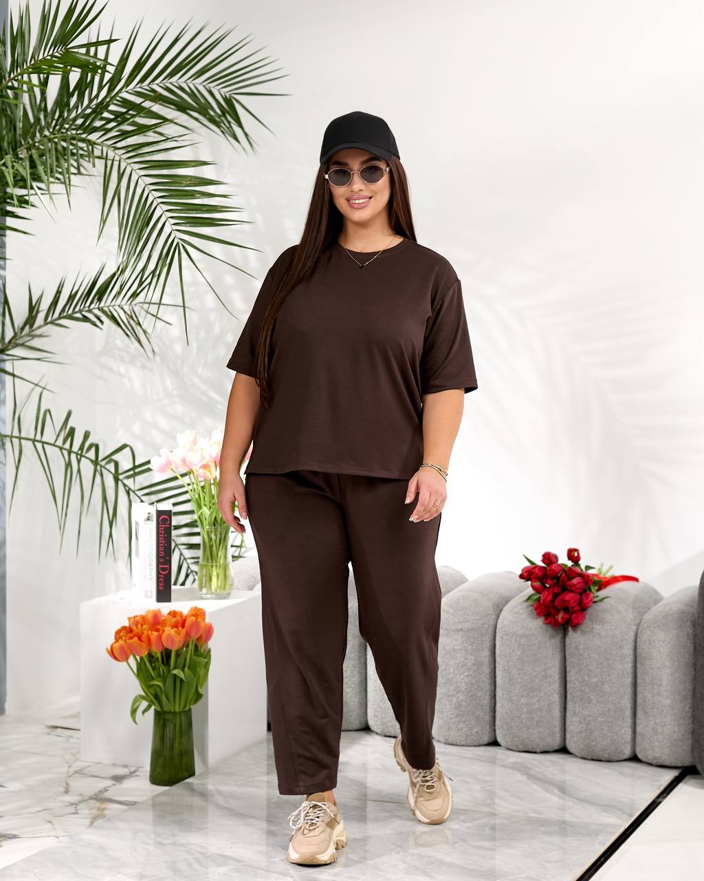 Стильний повсякденний костюм "Мілана" ✨Розміри: 46-48, 50-52, 54-56, 58-60 ✨Тканина: трикотаж двунитка Футболка вільного крою дарує свободу рухів і легко комбінується з іншими речами гардеробу. Штани мають зручну середню посадку, укорочені, широкі,виглядають стильно та акуратно. 🌈Кольори: чорний, бордовий, графітовий, шоколадний ✨Заміри✨ Футболка Обʼєм грудей: 108, 116, 124, 132 Довжина рукава: 26, 27, 28, 29 Довжина виробу: 64, 66, 76, 67 Штани Обʼєм стегон: 118, 126, 134, 142 Довжина виробу: 91, 93, 95, 97