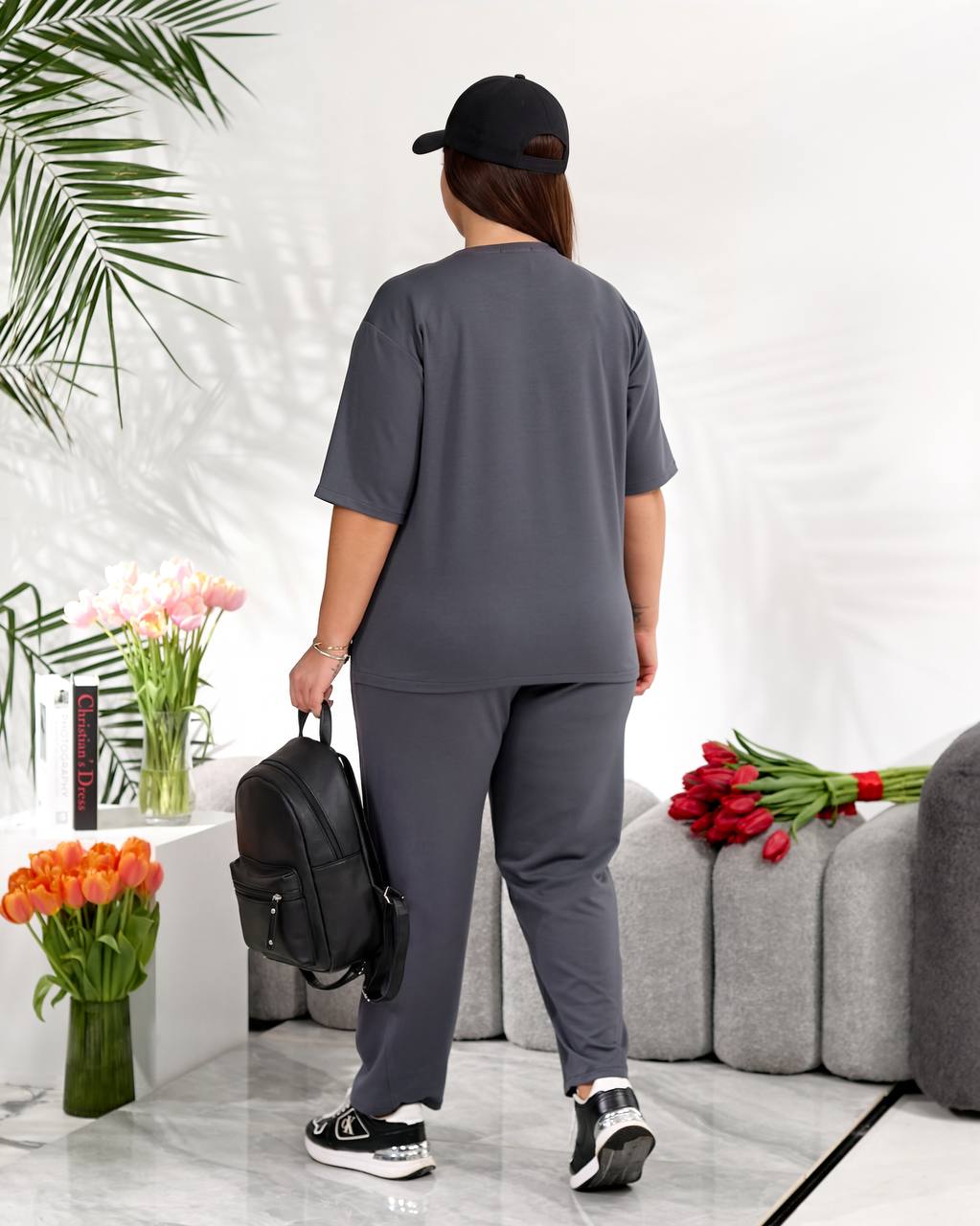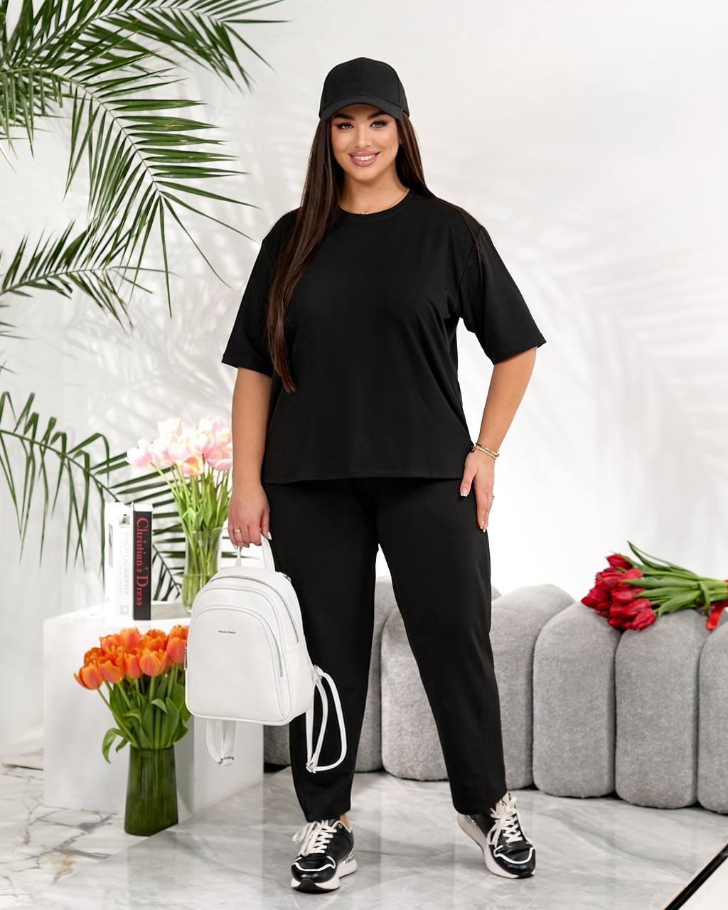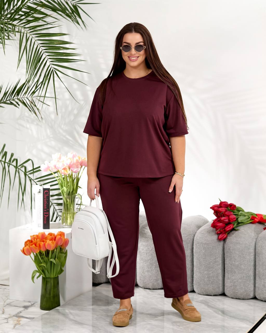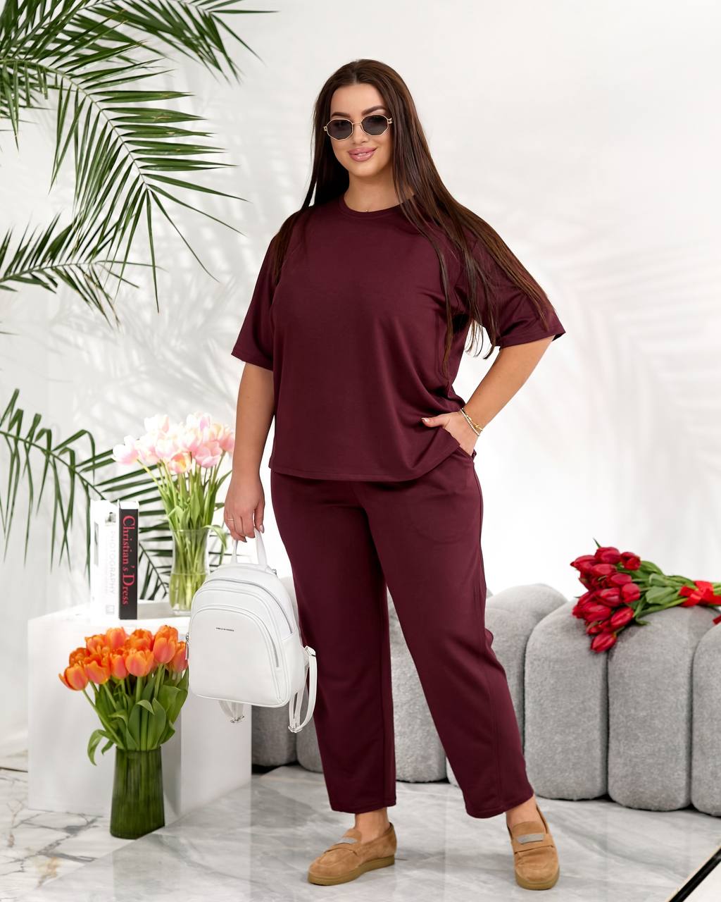 Стильний повсякденний костюм "Мілана" ✨Розміри: 46-48, 50-52, 54-56, 58-60 ✨Тканина: трикотаж двунитка Футболка вільного крою дарує свободу рухів і легко комбінується з іншими речами гардеробу. Штани мають зручну середню посадку, укорочені, широкі,виглядають стильно та акуратно. 🌈Кольори: чорний, бордовий, графітовий, шоколадний ✨Заміри✨ Футболка Обʼєм грудей: 108, 116, 124, 132 Довжина рукава: 26, 27, 28, 29 Довжина виробу: 64, 66, 76, 67 Штани Обʼєм стегон: 118, 126, 134, 142 Довжина виробу: 91, 93, 95, 97