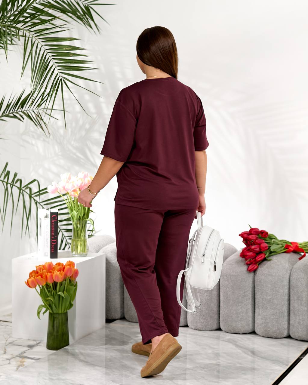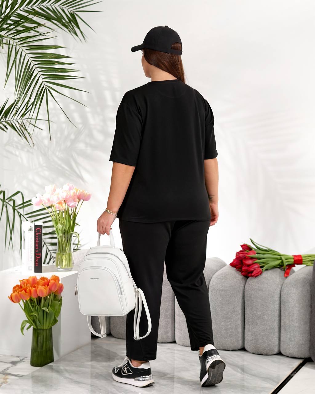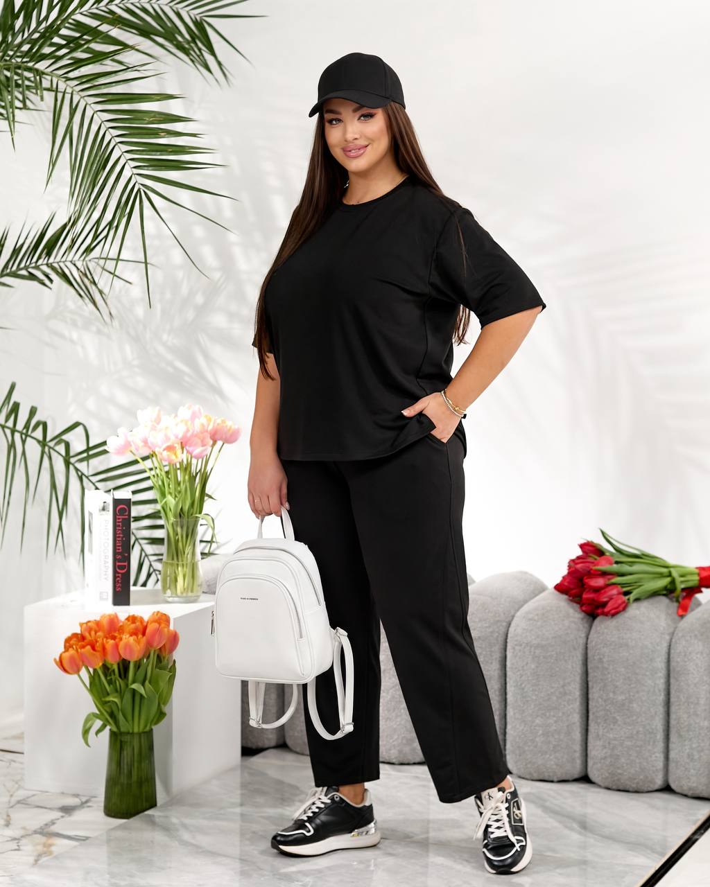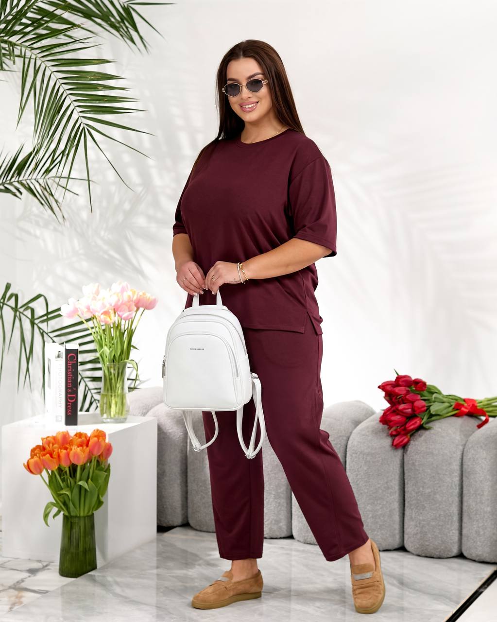 Стильний повсякденний костюм "Мілана" ✨Розміри: 46-48, 50-52, 54-56, 58-60 ✨Тканина: трикотаж двунитка Футболка вільного крою дарує свободу рухів і легко комбінується з іншими речами гардеробу. Штани мають зручну середню посадку, укорочені, широкі,виглядають стильно та акуратно. 🌈Кольори: чорний, бордовий, графітовий, шоколадний ✨Заміри✨ Футболка Обʼєм грудей: 108, 116, 124, 132 Довжина рукава: 26, 27, 28, 29 Довжина виробу: 64, 66, 76, 67 Штани Обʼєм стегон: 118, 126, 134, 142 Довжина виробу: 91, 93, 95, 97